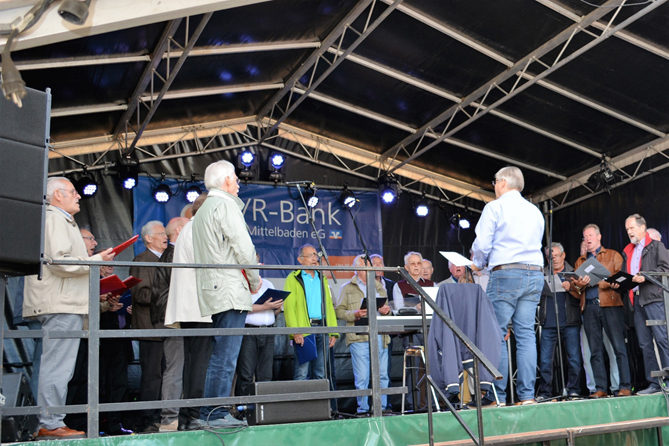 Auch unser Männerchor sorgte am Sonntagmittag auf der Hauptbühne für beste Unterhaltung. Mit insgesamt 4 Liedern waren wir trotz unserer Sommerpause auf der Bühne present. Von „Aus der Traube in die Tonne“ bis zu den „Drei lachende Mädchen“ konnten wir das Publikum überzeugen. Herzlichen Dank unserem Dirigent Matthias Hammerschmitt, der kurz vor seinem Urlaub diesen Auftritt leitete und der zuvor auch als Organist den Gottesdienst auf der Bühne begleitete.