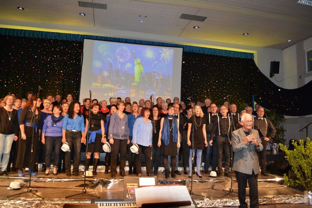 Zahlenmäßig große Auftritte kündigten den nahen Schluss des Konzerts an. Zusammen mit dem Männerchor, der nun zusätzlich noch auf die Bühne kam, stimmten nun alle das von Theo Wild arrangierte Udo Jürgens‘-Lied an „Ich war noch niemals in New York“. Eingebettet in diesen Welthit des österreichischen Stars erklangt nach einem mystischen Übergang das „New York, New York“ der Chorformation „Good Vibrations, die nun ebenfalls auf der Bühne präsent war, bevor es gesanglich wieder zurück ging in das verstaubte Alltagsgeschehen aus „Ich war noch niemals in New York“ als in der Geschichte die Frau ihren Mann fragt, „Wo warst Du denn? War etwas? Das Musical von New York bis Ötigheim“ geht gleich los!“.